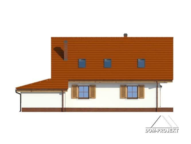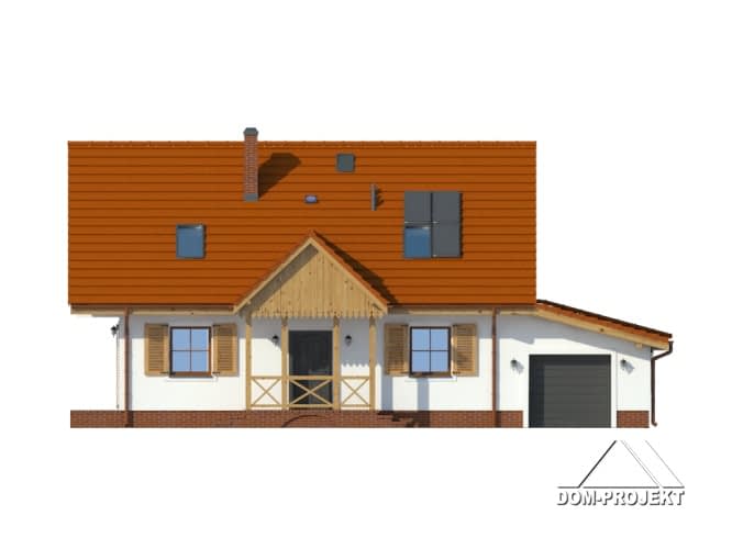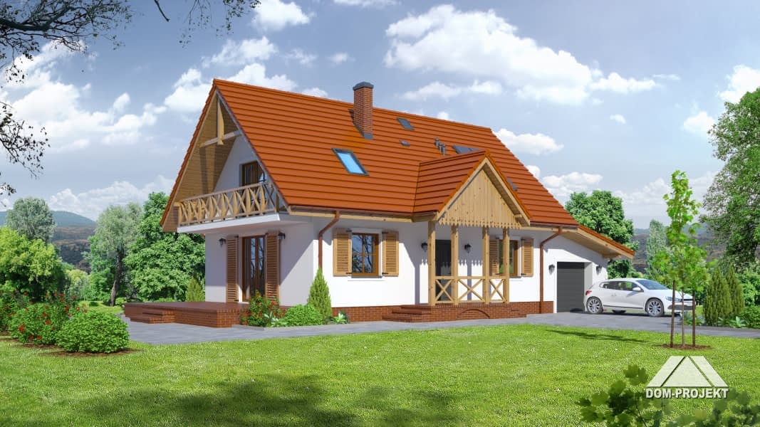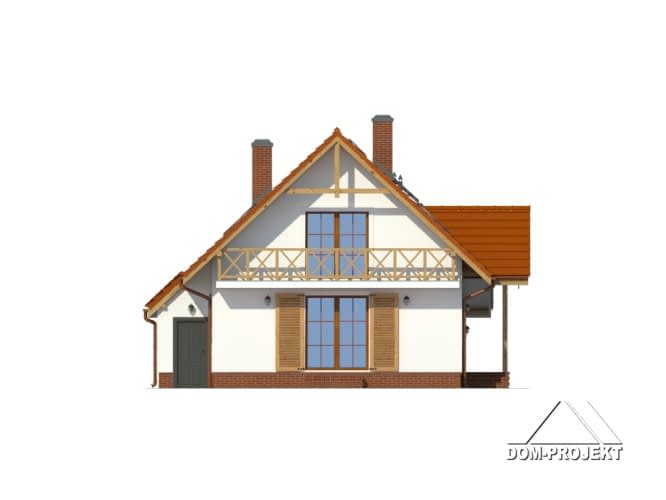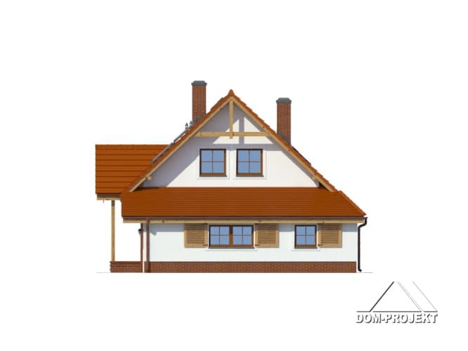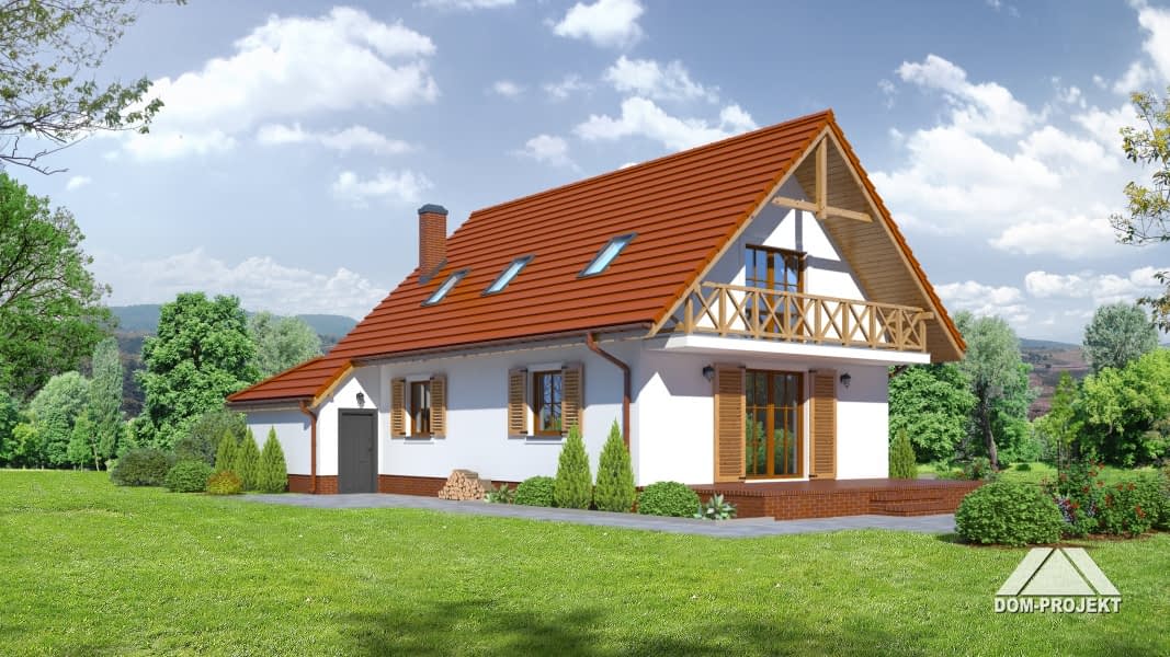 Dom dla 4-5 osobowej rodziny. Duży salon z aneksem kuchennym, kominkiem, wyjściem na taras i schodami na poddasze. Pokój, łazienka, wiatrołap, pomieszczenie gospodarcze,garaż, kotłownia. Na poddaszu trzy pokoje, łazienka i komunikacja. Największy pokój poddasza ma balkon. Zwarta bryła budynku sprzyja szybkiej i taniej budowie oraz niskim kosztom realizacji.Rzuty