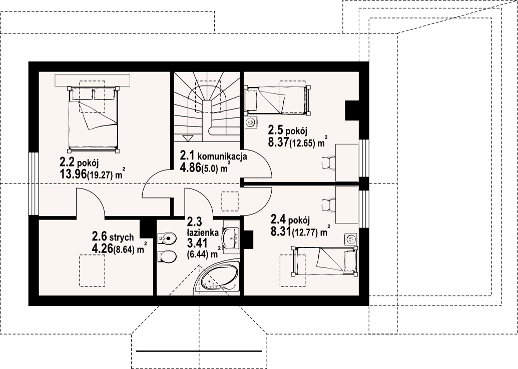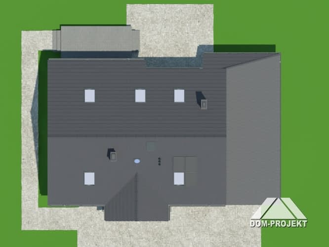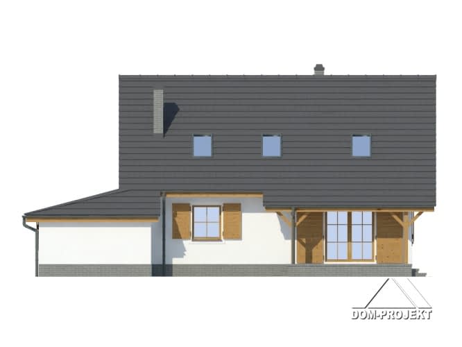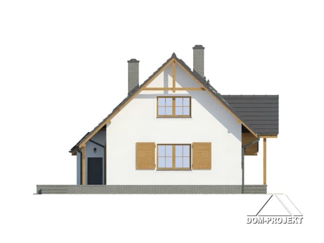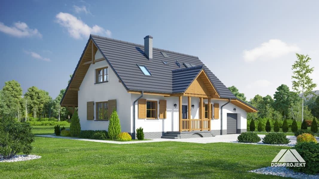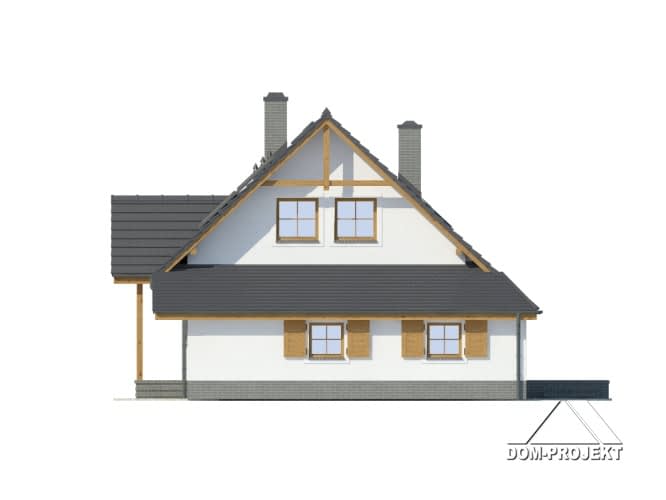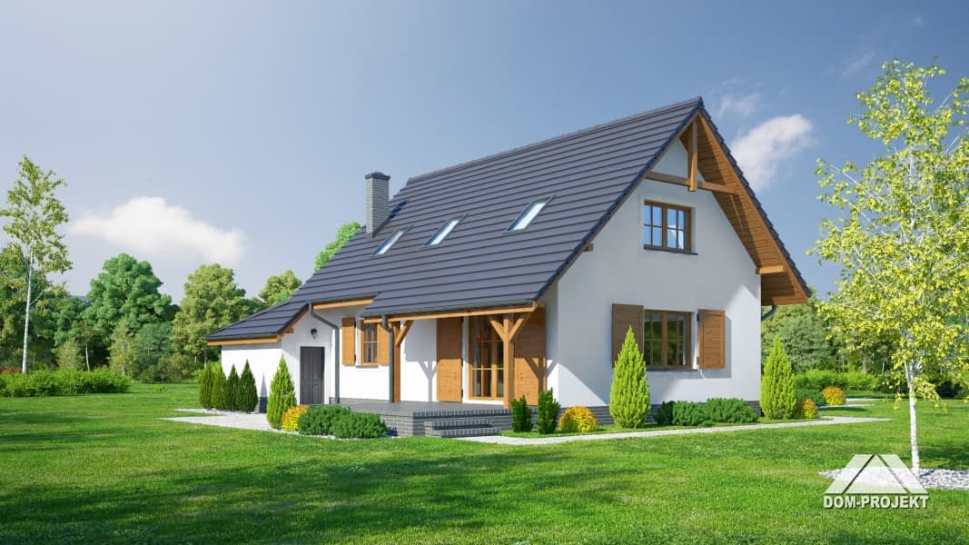 Atrakcyjny dom z poddaszem użytkowym w konstrukcji szkieletu drewnianego. Duży salon z aneksem kuchennym, kominkiem, wyjściem na taras i schodami na poddasze. Pokój, łazienka, wiatrołap, pomieszczenie gospodarcze garaż i kotłownia. Na poddaszu trzy pokoje, łazienka, strych i komunikacja. Zwarta bryła budynku i dach dwuspadowy sprzyjają taniej i szybkiej budowie i niskim kosztom eksploatacji.Rzuty