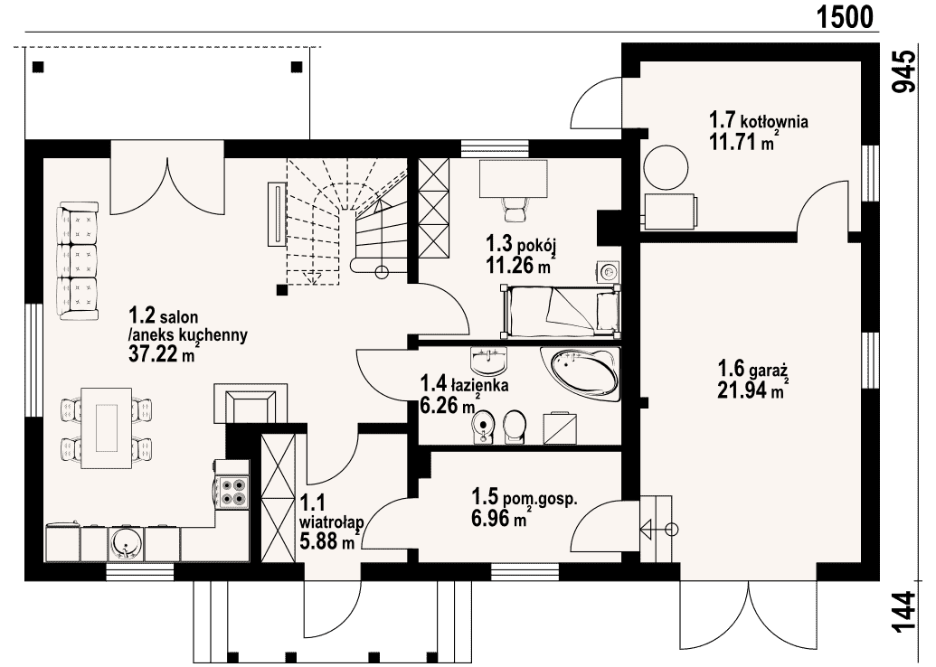 - 1.2 - salon z aneksem kuchennym37.22 m²