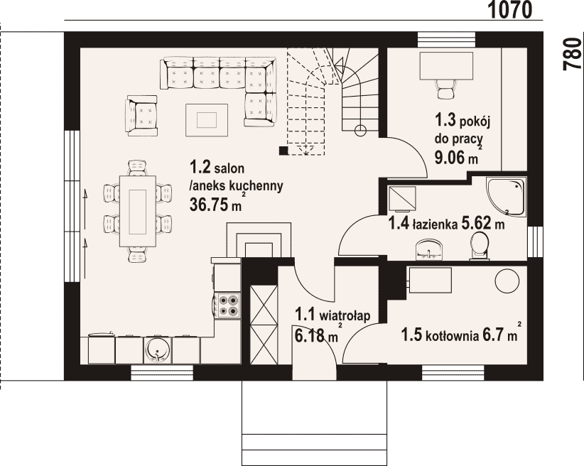 - 1.2 - salon z aneksem kuchennym36.75 m²
