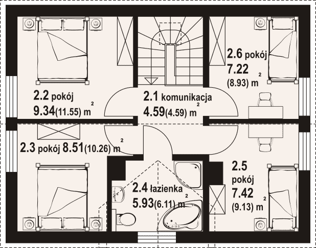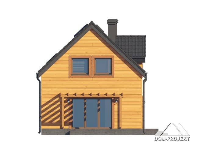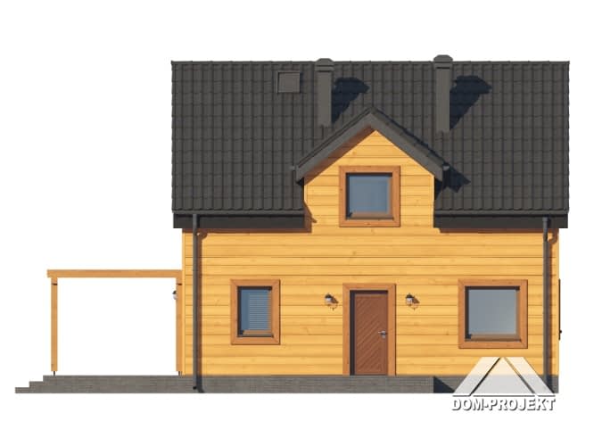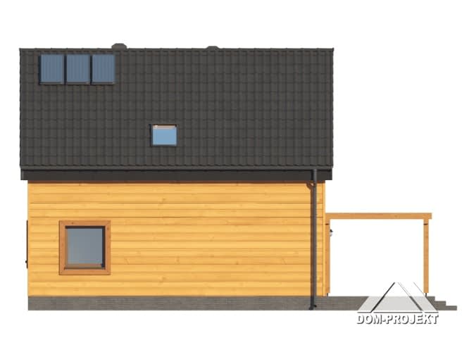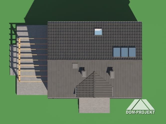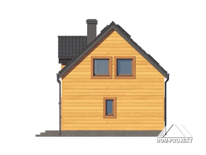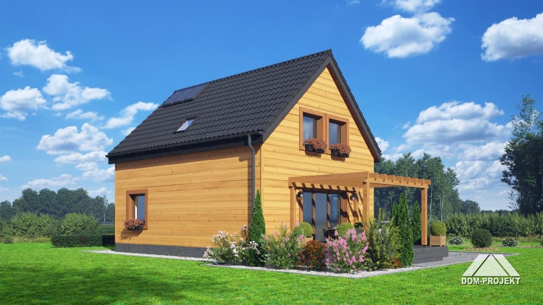 Dom w konstrukcji szkieletu drewnianego. Na parterze salon z aneksem kuchennym, kominkiem, wyjściem na taras i schodami na poddasze. Pokój, wc, kotłownia, wiatrołap. Na poddaszu cztery pokoje, łazienka, komunikacja. Zwarta bryła budynku oraz dach dwuspadowy sprzyjają szybkiej i taniej budowie oraz niskim kosztom eksploatacji.Rzuty