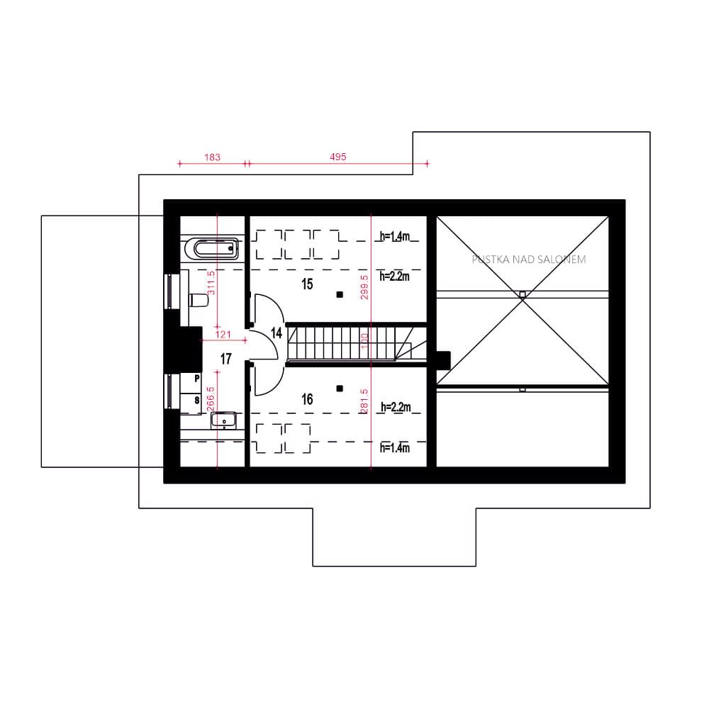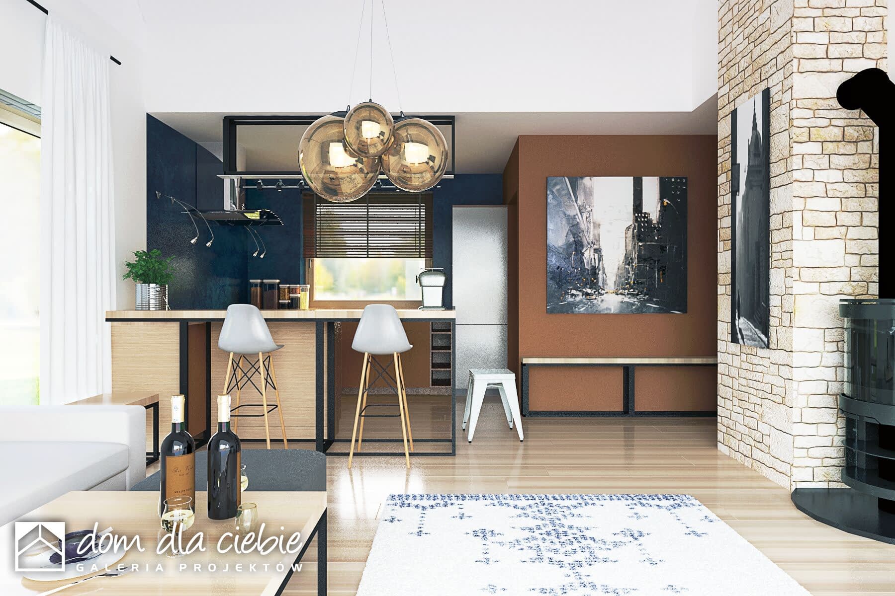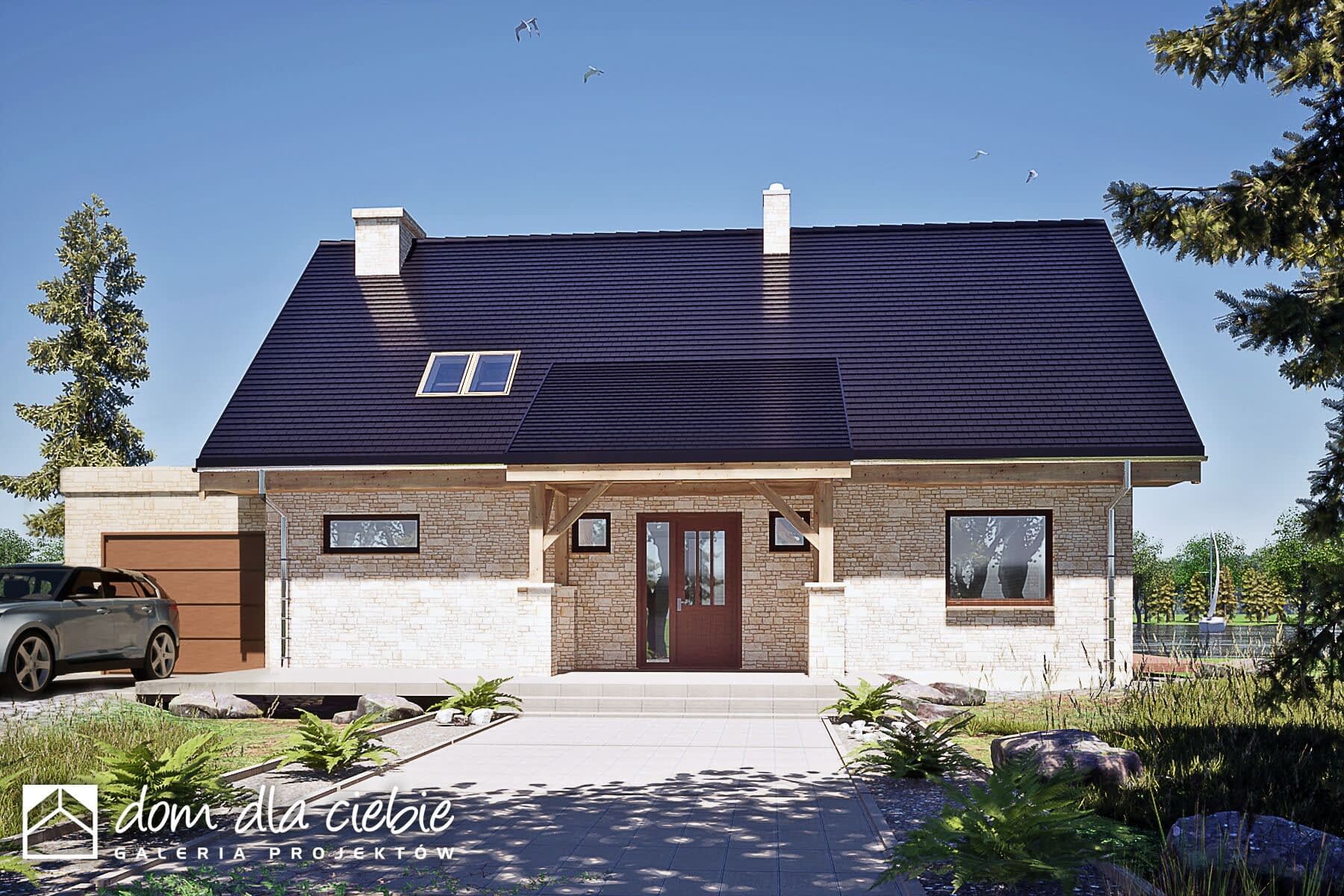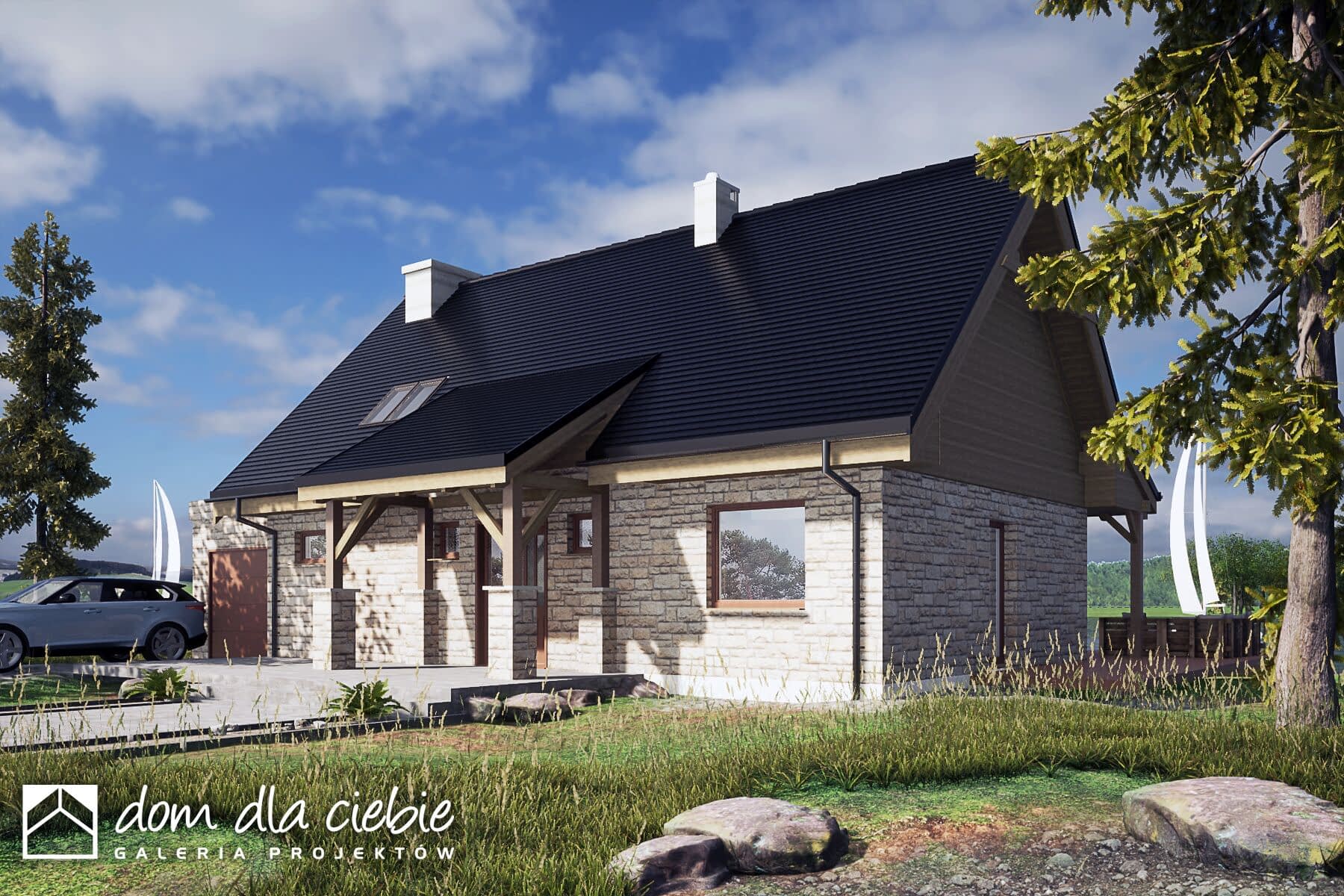 Projekt domu jednorodzinnego z poddaszem użytkowym dla 4 osobowej rodziny oraz garażem. Prosta bryła jest przekryta dwuspadowym dachem o kącie nachylenia 45 stopni. Dzięki nieskomplikowanej bryle dom będzie tani i prosty w budowie i eksploatacji.Charakter budynku podkreślają wykończenia elewacji okładzina kamienna oraz drewniane wykończenia.Salon z jadalnią nie ma sufitu podwieszanego i jest otwarty aż do dachu. W salonie przewidziano kominek.Kuchnia jest otwarta i umeblowana w kształcie litery L . Obok kuchni zaproponowano stół jadalny.W strefie wejściowej zaprojektowano duży hol, do którego prowadzi wiatrołap. Hol rozprowadza do garderoby, pomieszczenia technicznego, WC, pokoju dla dwóch osób oraz na poddasze. Dwuosobowa sypialnia posiada indywidualna przejściową garderobę oraz niewielka łazienkę z natryskiem.Na poddaszu mamy dwie sypialne oraz łazienkę z pralnia i suszarnią.Projekt Ziomek dedykowany jest szczególnie na tereny podmiejskie, do nowej i starej zabudowy