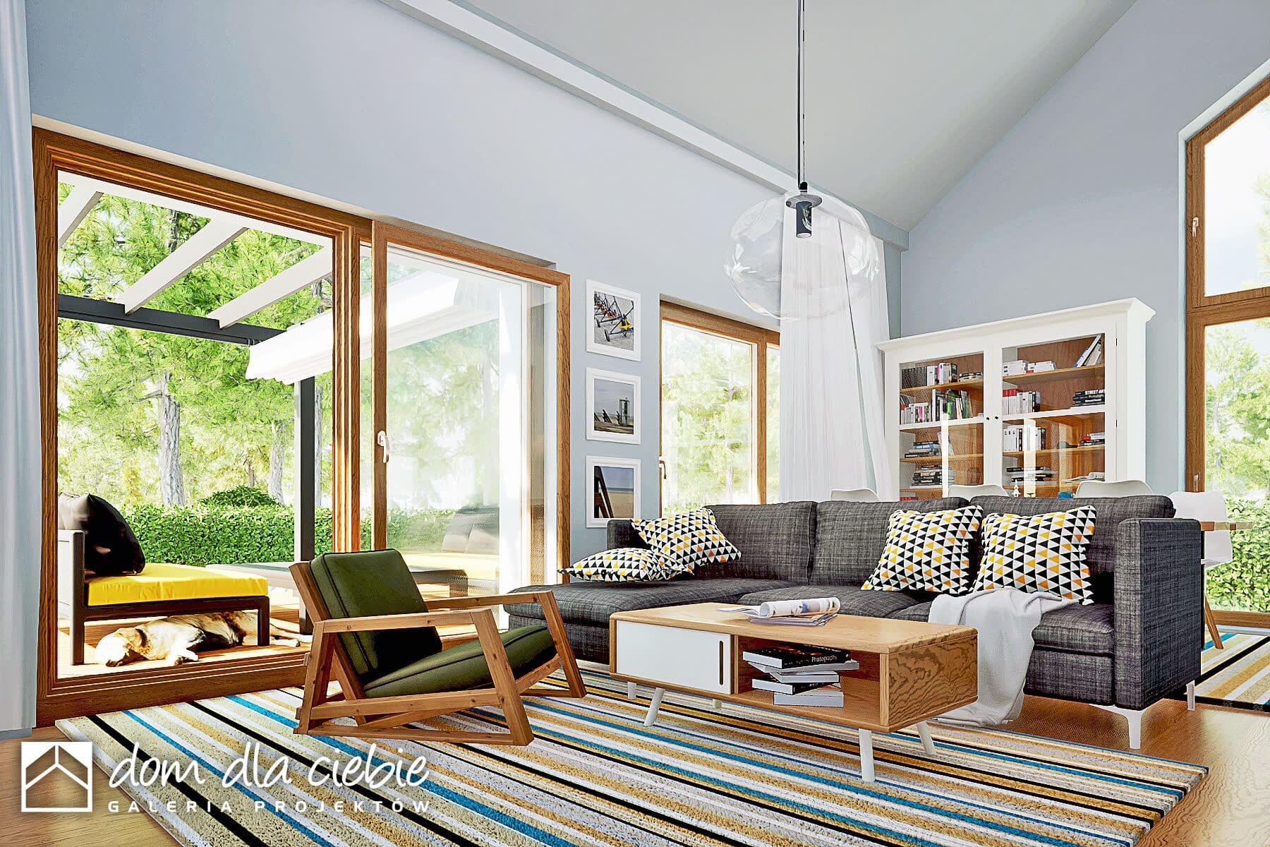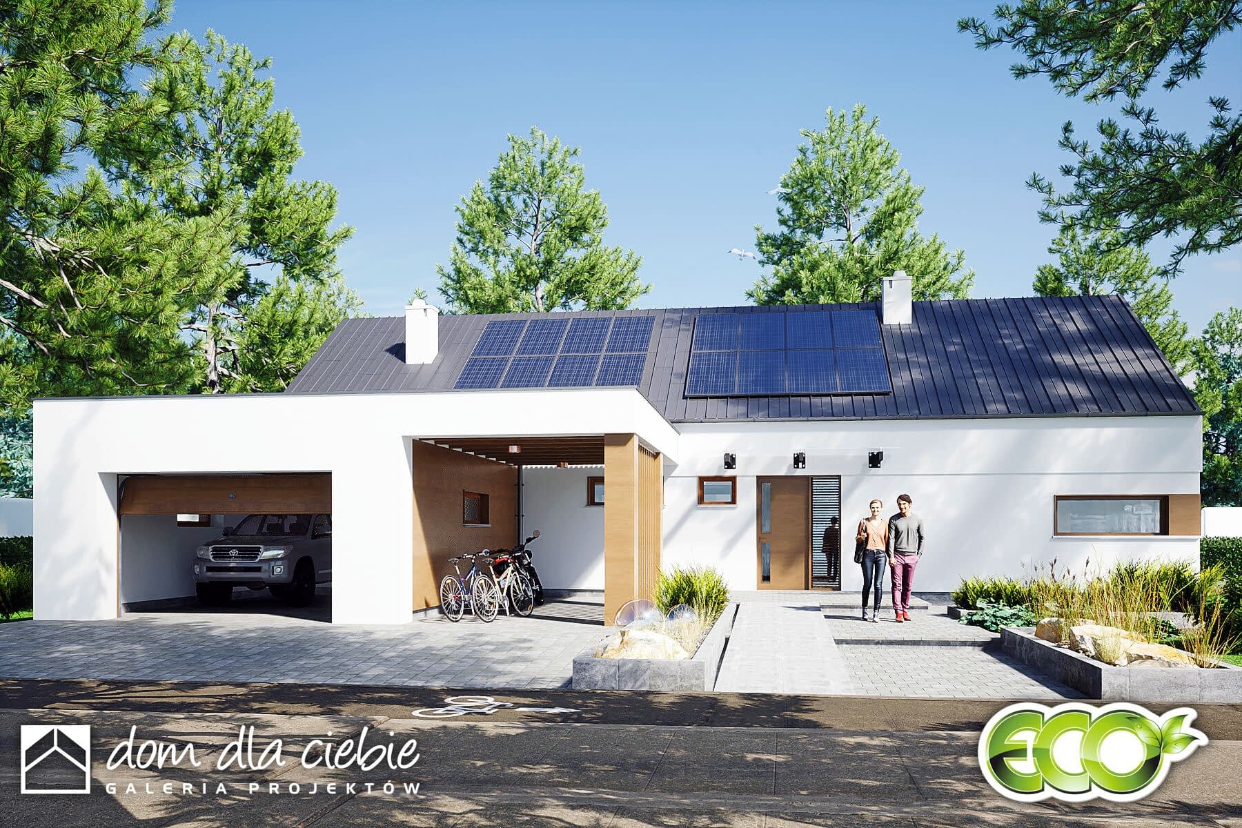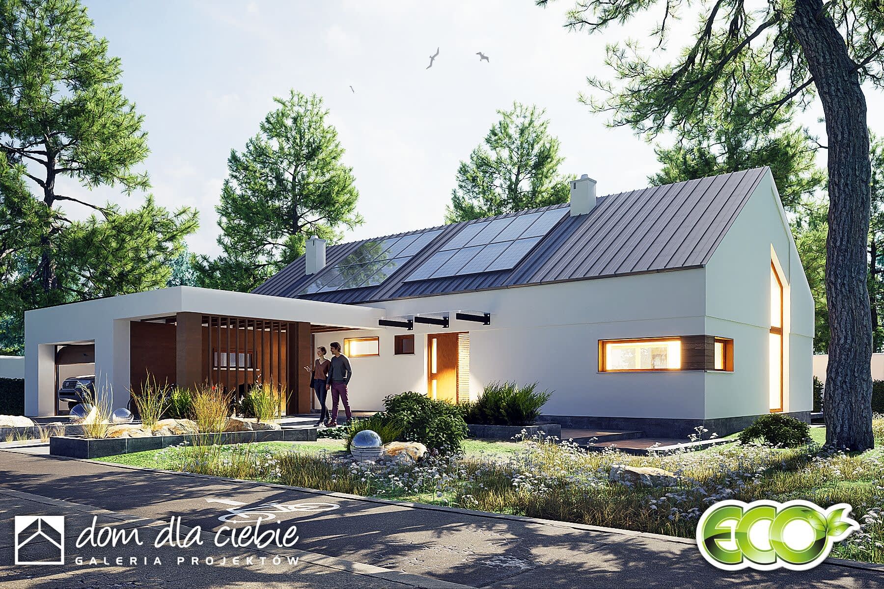 Złota II to nowoczesny, parterowy dom z wiatą i garażem dla 4 osobowej rodziny. Dom w tradycyjnej technologii z dachem z prefabrykowanych wiązarów. Strop stanowi dolny drewniany pas konstrukcji wiązarów dachowej. Istnieje możliwość wykonania klasycznej więźby dachowej i stropu gęstotożebrowego. Dach jest dwuspadowy o kącie nachylenia 35 stopni.Wspólna przestrzeń składa się z wysokiego salonu z kominkiem, kuchni ze spiżarnią oraz jadalni.W prywatnej strefie domu znajdują się dwie mniejsze sypialnie i duża sypialnia z garderobą. W strefie nocnej przewidziano łazienkę ogólną, niewielkie WC oraz pomieszczenie technicznym (pralnia , suszarnia) z piecem CO.Elewacja budynku utrzymana w kolorze białym z elementami drewna.Złota II to bardzo dobra inwestycją finansową.