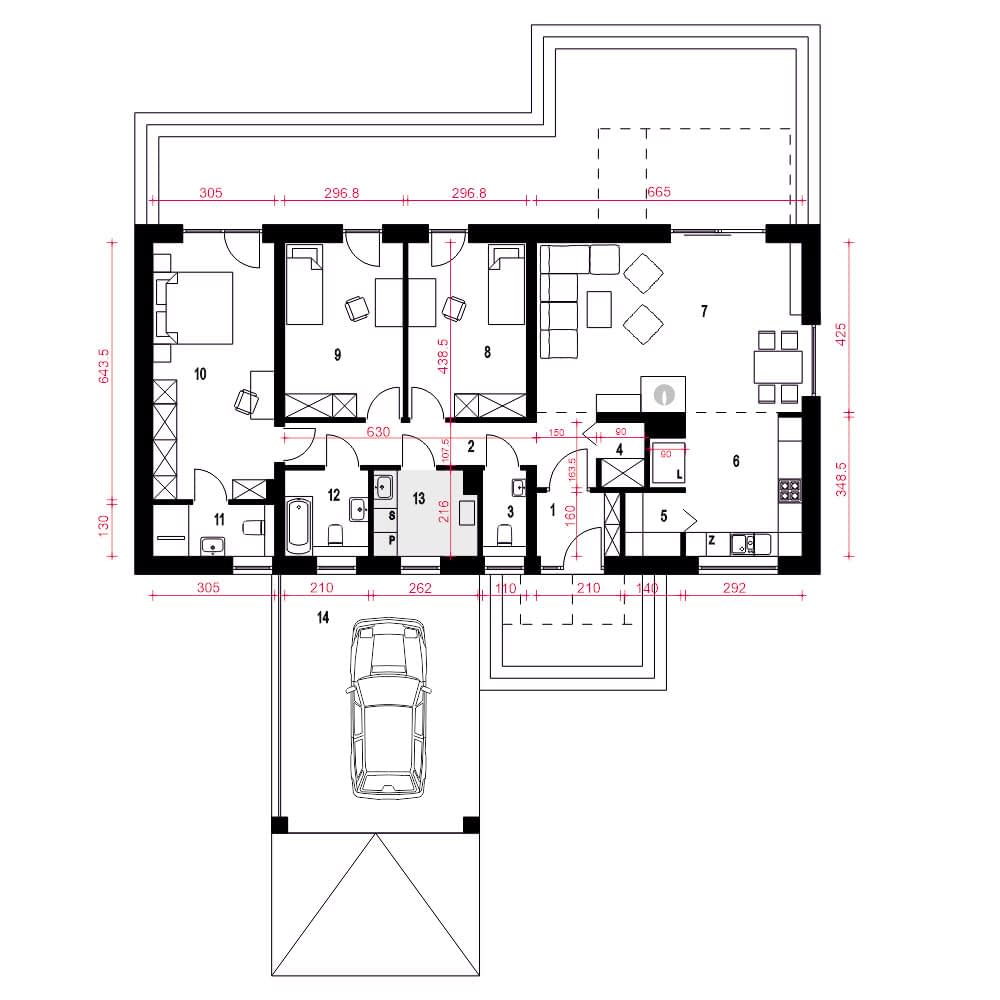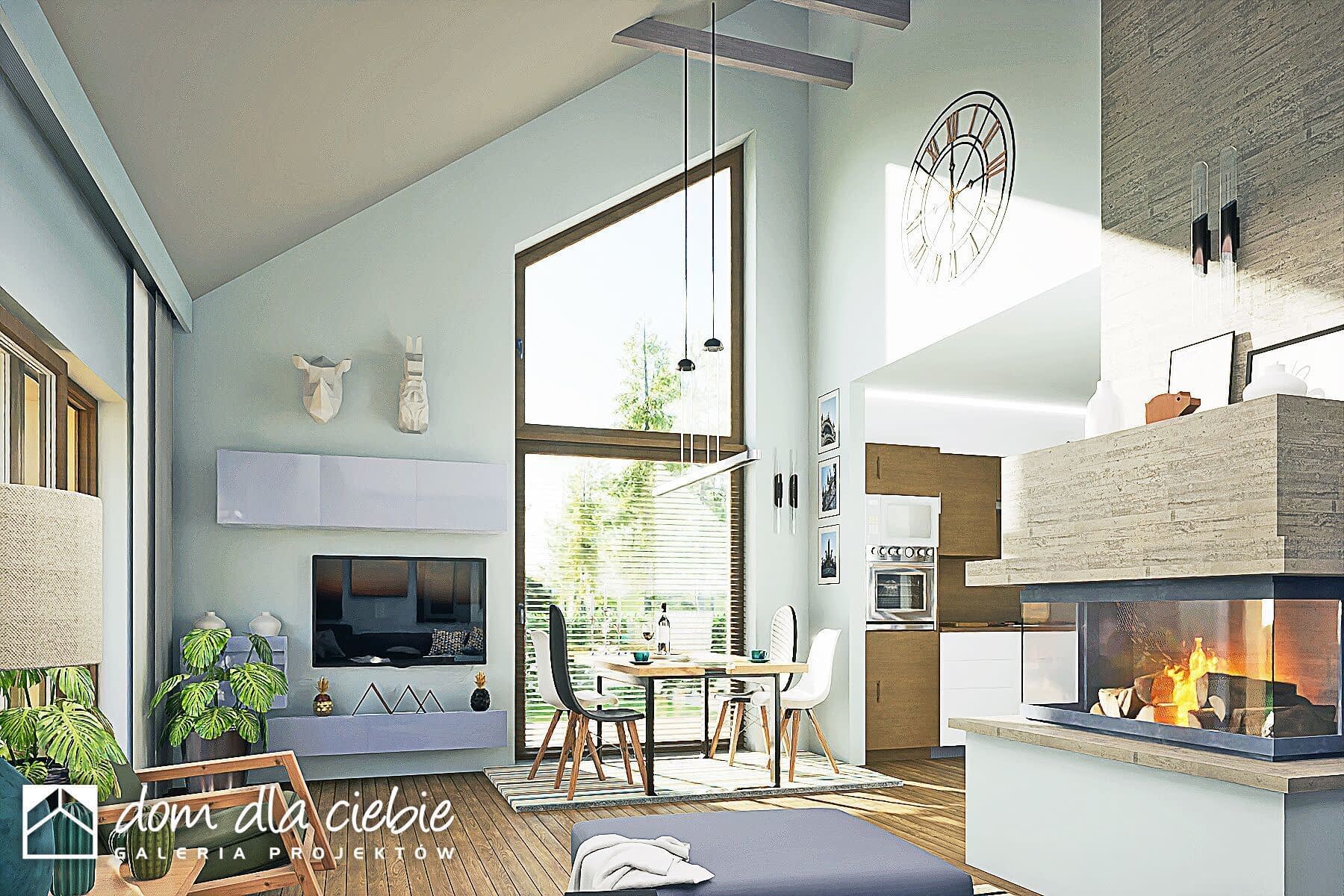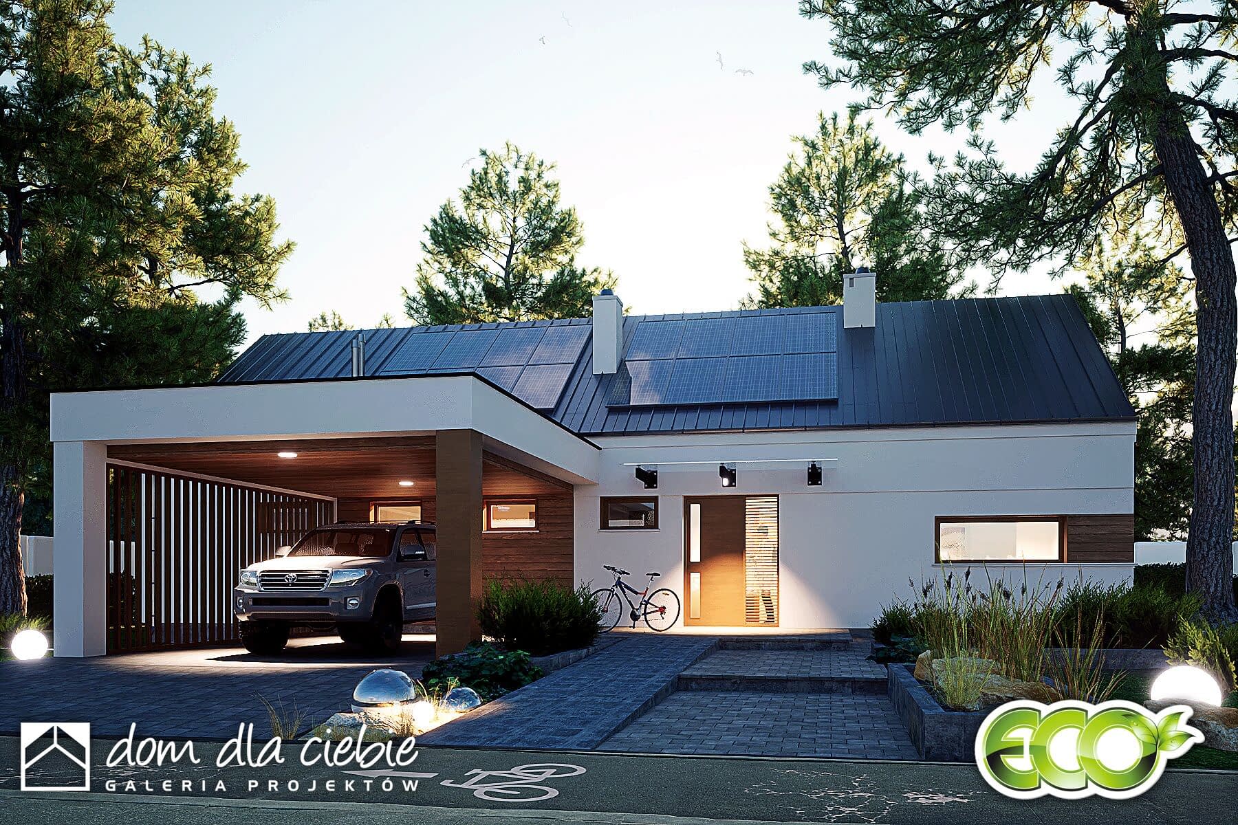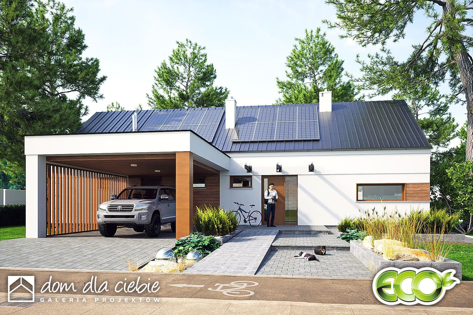 Złota to mały, nowoczesny, parterowy dom z wiatą dla 4 osobowej rodziny. Dom w tradycyjnej technologii z dachem z prefabrykowanych wiązarów. Strop stanowi dolny drewniany pas konstrukcji wiązarów dachowej. Istnieje możliwość wykonania klasycznej więźby dachowej i stropu gęstotożebrowego. Dach jest dwuspadowy o kącie nachylenia 35 stopni.Wspólna przestrzeń składa się z wysokiego salonu z kominkiem, kuchni ze spiżarnią oraz jadalni.W prywatnej strefie domu znajdują się dwie mniejsze sypialnie i duża sypialnia z łazienką i miejscem na szafy. W strefie nocnej przewidziano łazienkę ogólną, niewielkie WC oraz pomieszczenie technicznym (pralnia , suszarnia) z piecem CO.Elewacja budynku utrzymana w kolorze białym z elementami drewna.Złota to bardzo dobra inwestycją finansową.