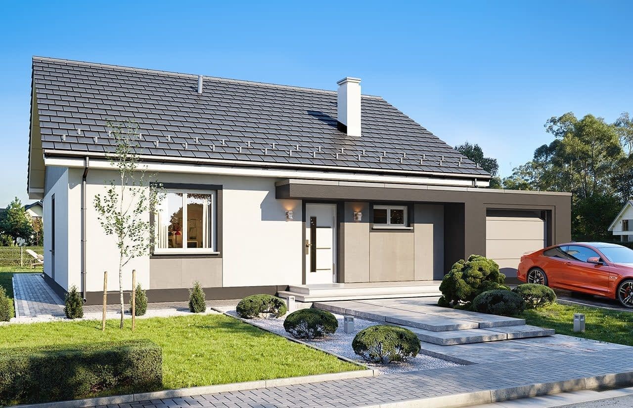 Projekt domu Zosia 7 B to wersja wariantowa projektu „Zosia” - czyli największa, maksymalnie rozbudowana wersja domu z tej serii, o kwadratowym planie o wymiarach 10,7 x 10,7 m, oraz z dobudowanym garażem. Dom ma nadal - tak jak pozostałe projekty z serii „Zosia” - prostą bryłę i konstrukcję, ale zyskał nowoczesny sznyt i jest urozmaicony detalami jak garaż z płaskim dachem, czy komponujące się z garażem zadaszenie drzwi wejściowych, czy wreszcie pergola przykrywająca część tarasu ogrodowego. Projekt domu Zosia 7 B, mimo kilku urozmaiceń, dzięki swojej prostocie jest łatwy w budowie, a przez to niedrogi. Jednocześnie funkcjonalnie w stu procentach spełnia wymagania komfortowego mieszkania dla cztero- czy nawet sześcioosobowej osobowej rodziny. Budynek przykryto dwuspadowym dachem o kącie 30 stopni. Nad parterem przewidziano strop drewniany belkowy i poddasze użytkowe z dwoma pokojami, na które dostajemy się schodami między kuchnią i łazienką. Do domu wchodzimy przez przedsionek z dużą szafą do holu i salonu. Z boku przy wejściu przechodzimy do kotłowni i dalej do garażu. Kotłownia została przewidziana w projekcie jako gazowa, ale łatwo można ją przerobić na kotłownię na paliwo stałe. Dalej mamy łazienkę i schody (pod schodami od strony garażu mieści się praktyczny schowek). Z lewej strony mamy trzy sypialnie, w tym sypialnię rodziców z garderobą. Pozostała część wnętrza to salon z aneksem kuchennym o powierzchni około 35 m2. Z salonu wydostajemy się do ogrodu i na tarasy. Taras o kształcie litery L jest częściowo odkryty, a częściowo przesłonięty pergolą.Na poddaszu zaprojektowano dodatkowe dwa pokoje i łazienkę. Oczywiście poddasze może być pozostawione jako przestrzeń wolna, bez podziałów na pokoje, lub może to być po prostu strych, który w przyszłości zostanie zagospodarowany. Dom jest bardzo funkcjonalny i ma rozbudowany program pomieszczeń. Nie ma tutaj zmarnowanej przestrzeni - wszystko jest praktycznie wykorzystane. Dom ma bezpretensjonalną i przyjemną dla oka stylistykę. Zdecydowaną zaletą domków z serii „Zosia” jest ich prostota i funkcjonalność, przekładające się na maksymalny efekt inwestycji uzyskany za niewielkie pieniądze. Każdą kolejną wersję domu z tej serii staramy się projektować jeszcze lepiej i sensowniej. Dom Zosia 7 B jest zaprojektowany jako energooszczędny, bardzo dobrze ocieplony. Będzie dzięki temu tani w późniejszej eksploatacji. Zachęcamy do zapoznania się z pełną ofertą pracowni MG Projekt tej serii: projekt domu Zosia, projekt domu Zosia 2, projekt domu Zosia 3, projekt domu Zosia 4, projekt domu Zosia 5, projekt domu Zosia 6, projekt domu Zosia 7, projekt domu Zosia 8. Zapraszamy!